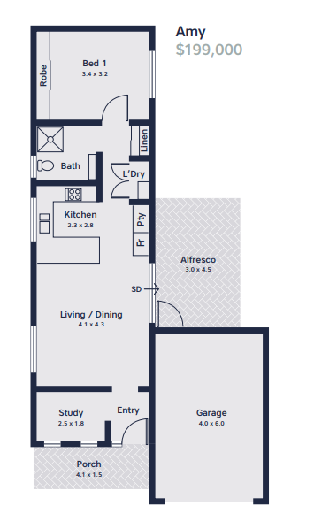 • 104m2 of total living area, including garage, porch, alfresco area and external shed